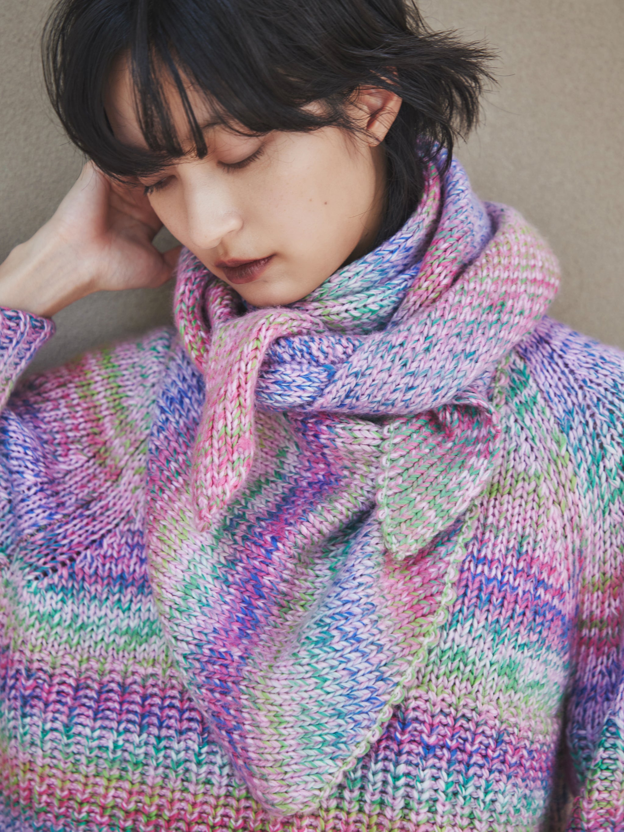 バルキーな編み地のミックスニット。たくさんのカラーが入った深みのあるハッピーな色展開です。